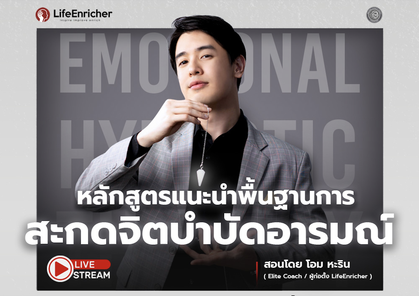 คุณ โอม หะริน จงเจริญรัตน์ : Elite Coach, CEO และผู้ก่อตั้งบริษัท Life Enricher Group Co.,Ltd. สถาบันให้การรับรอง Certified หลักสูตรNeuro Linguistic Programming หรือ จิตวิทยาสื่อประสาท มาตรฐานระดับสากลจาก ABNLP